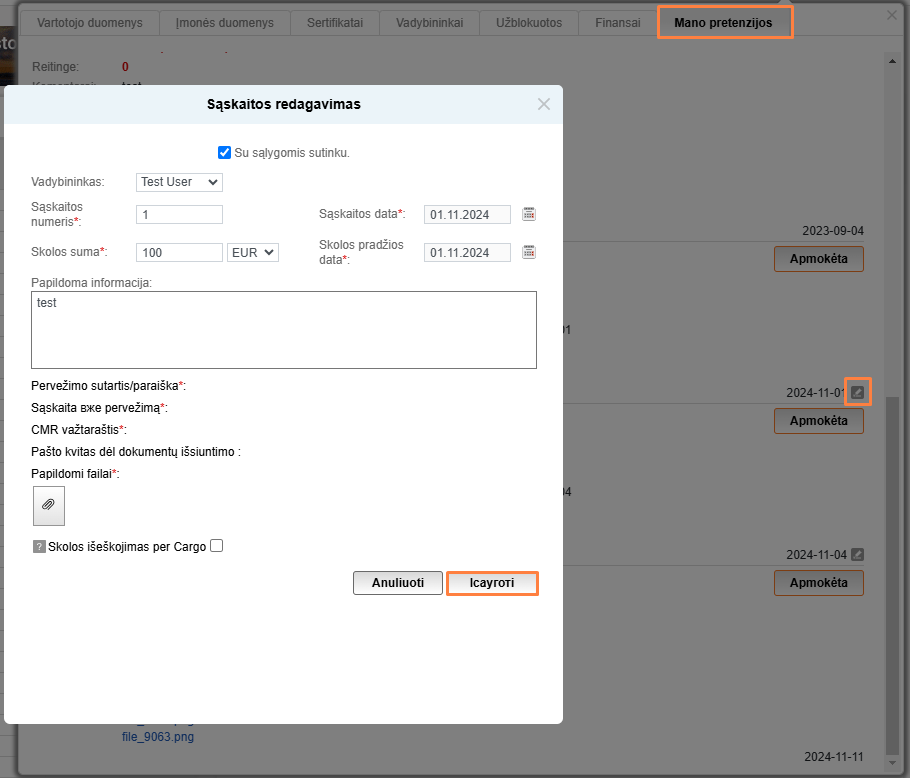Jei norite pakeisti neapmokėtą sąskaitą, pereikite prie vartotojo profilio spustelėję savo vardą skirtuke Mano pretenzijos. Šalia reikiamos sąskaitos spustelėkite Redaguoti. Atsidariusiame lange atlikite pakeitimus ir spustelėkite Įrašyti.