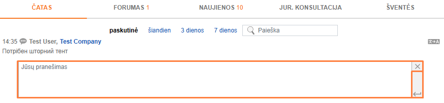 Pokalbiai rodomi puslapiuose: Pradžia, Kroviniai, Jūra, Avia, Transportas.