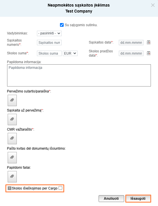Atsidariusiame lange pažymėkite Išieškokite skolą per Cargo ir spustelėkite Išsaugoti.