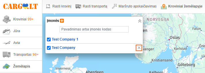 Jei norite pamatyti dominančios įmonės krovinius, spustelėkite piktogramą Pridėti įmonę ir įveskite jos pavadinimą arba kodą. Ateityje galima pažymėti arba išjungti pasirinktų įmonių krovinių rodymą. Pašalinkite įmonę iš sąrašo spustelėdami piktogramą Ištrinti įmonę priešais jos pavadinimą.