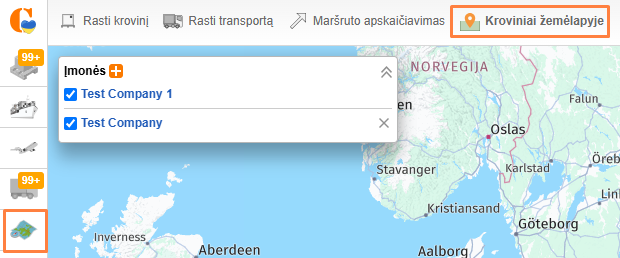 Jei norite, kad žemėlapyje būtų rodomos faktinės įmonės ar kitos suinteresuotos įmonės prekės, eikite į Žemėlapio skiltį, esančią skirtuke Kroviniai žemėlapyje.