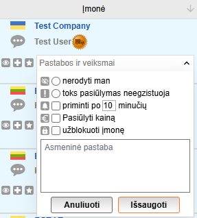 Galite tvarkyti pasiūlymus ieškant krovinio / transportavimo naudodami Pastabos ir Veiksmų funkcijas, kurios rodomos Užsakovo stulpelyje.